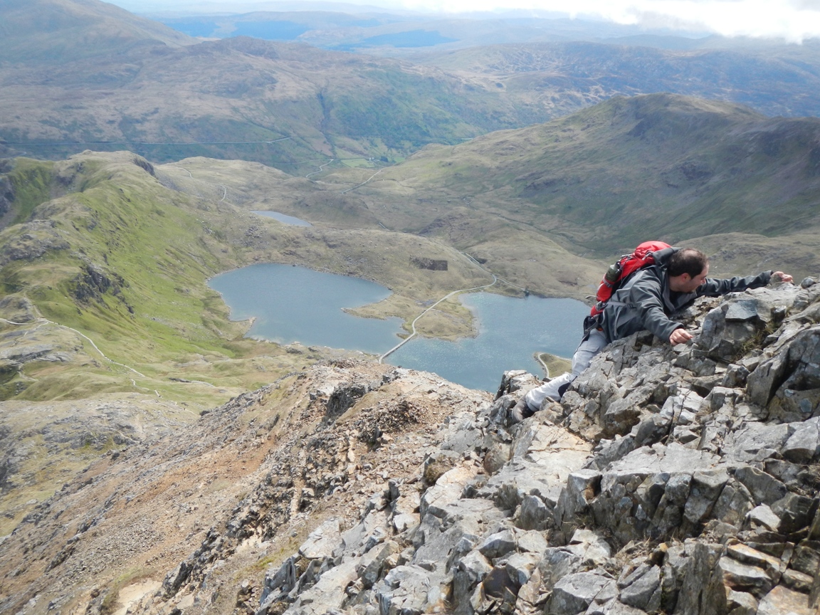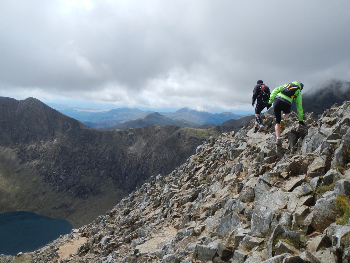 Sunday was a much more exciting day: Snowdon again, but running the Snowdon Horseshoe. Furthermore, no 30 kilo pack! The weather forecast was foreboding- gusts of 40-50mph wind, picking up to 60-70mph by the end of the day. We started at Pen-y-Pass, winding our way slowly up towards Crib Goch. Near the top, I found a grown man laying prostrate against the rock. He had taken an unnecessarily exposed route up, and it turns out he had a far of heights!
