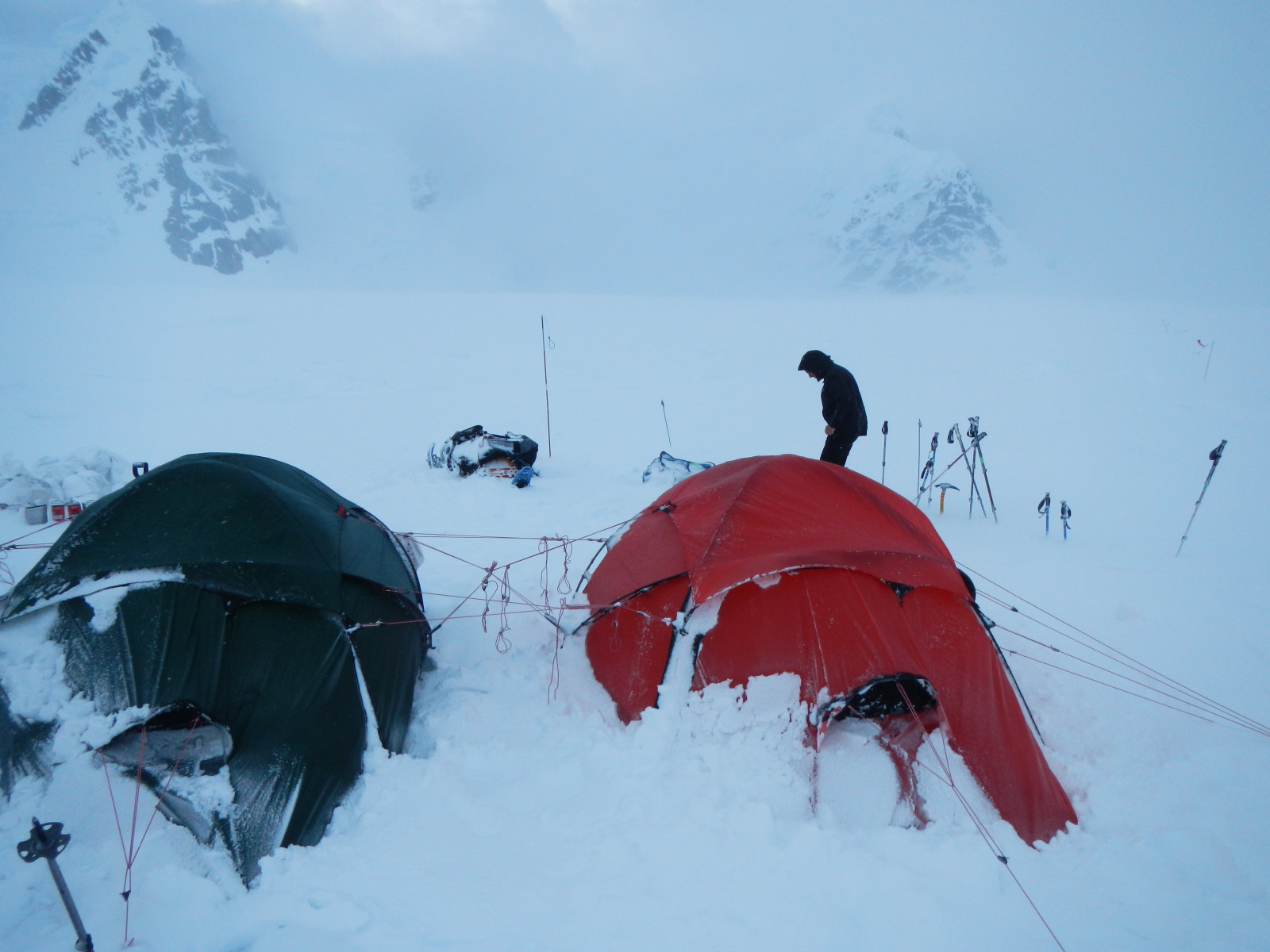 Building camp at Camp 1 is easy in good weather. We arrived and it was 18-19c and snowing. Shortly after our camp was erected, the wind came in and tested our tents.