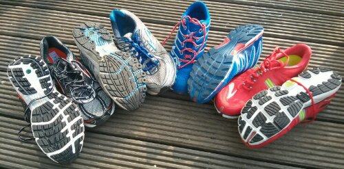I know I needed new road shoes – my old faithfuls are the Brooks Trance 11 pair, second from the left. I’ve been putting the miles on these for a couple of years and are my favourite road running shoes. Over time they’ve moulded to my feet and I’ve grown accustomed to that feeling like I’m running on clouds. I have elastic laces on them so I can get them on quickly in triathlons. However, they’re a bit tired now, so I shelled out for the Brooks Trance 12. The Trance 12 is the last in the Trance series – I’ve been told that Brooks will not update this model any further (although expect a new model to be announced in the next month or two).