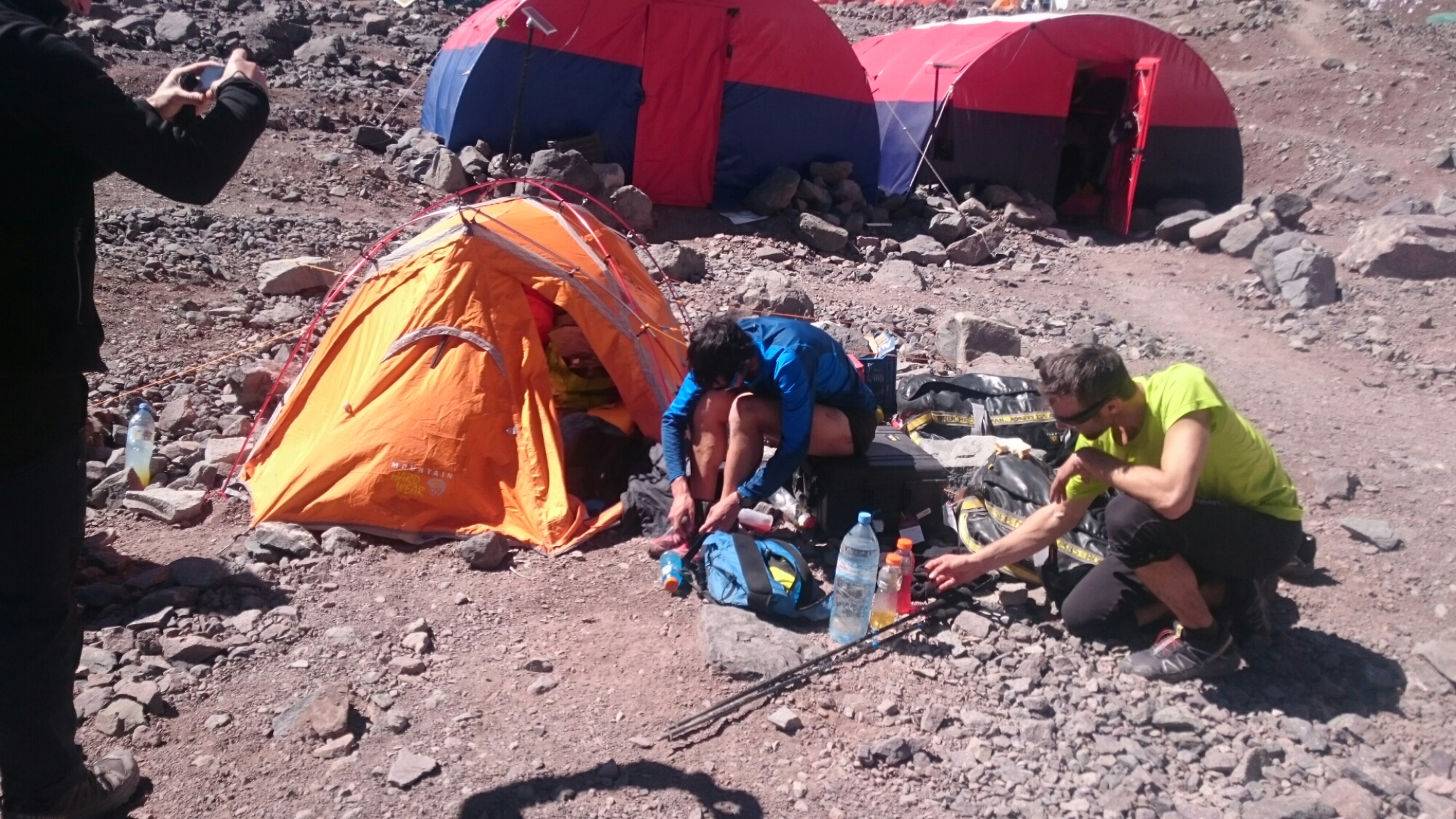 Here’s a picture of Kilian and Seb Montaz at Base Camp (4300m above sea level) as Kilian changes into lighter running gear for his descent back to the Horcones Valley.