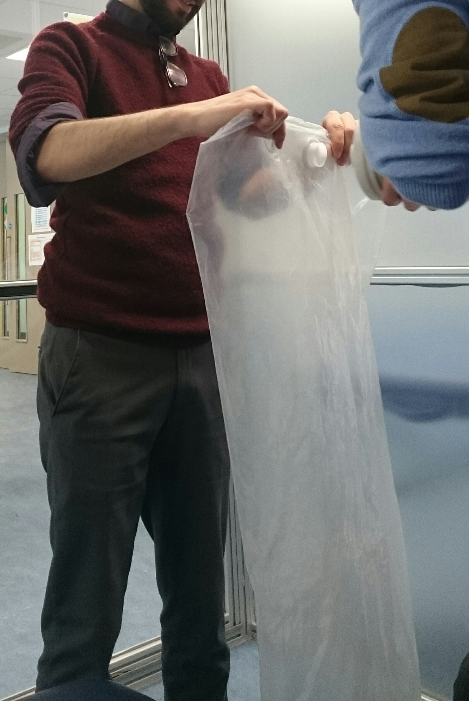 Despite the amount of funding this setup clearly had, the process for when we needed a loo break was a little bit rudimentary and hilarious (although in my oxygen-deprived state I foudn other things funnier than they should have been). It involved one researcher holding a thick plastic bag with a hole, whilst another one pushed air in using a pump (which wasn’t intended for that purpose). The pump was not the correct diameter for the hole in the bag, and it happened to make a farcical noise with each stroke. After much labour in an oxygen-deprived environment, the bag would be a bit more balloon-like, containing approximately 40 litres of air, which translated to about 120 seconds of breathing time. Once the one-way breathing valve apparatus was attached, that gave me or the other participant barely enough time to step out of the hypoxic chamber with a nosepeg and this big bag attached to our mouths, before tottering across the lab, down a corridor, past bemused workers to the toilets, before returning before the bag emptied of air entirely!