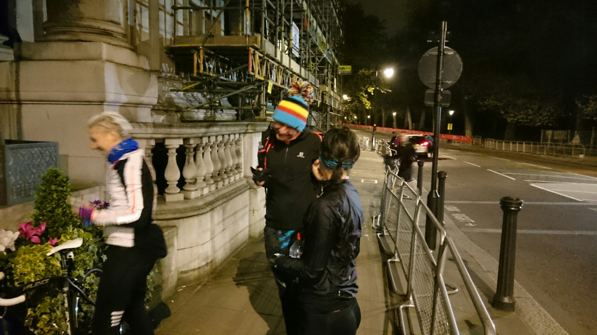 The alarm woke me at 2.30am on Sunday, and with my 3 hours of sleep I rolled out of the inflatable bed, changed into running kit and hailed a cab to get through the streets of central London, heading to the meeting point. The meeting point was obscured by scaffolding, London Marathon bunting and temporary fences, so I had to round the final corner on foot before I was spotted two other people, in running kit, huddling in the porch of the agreed rendezvous point, out of the cold.