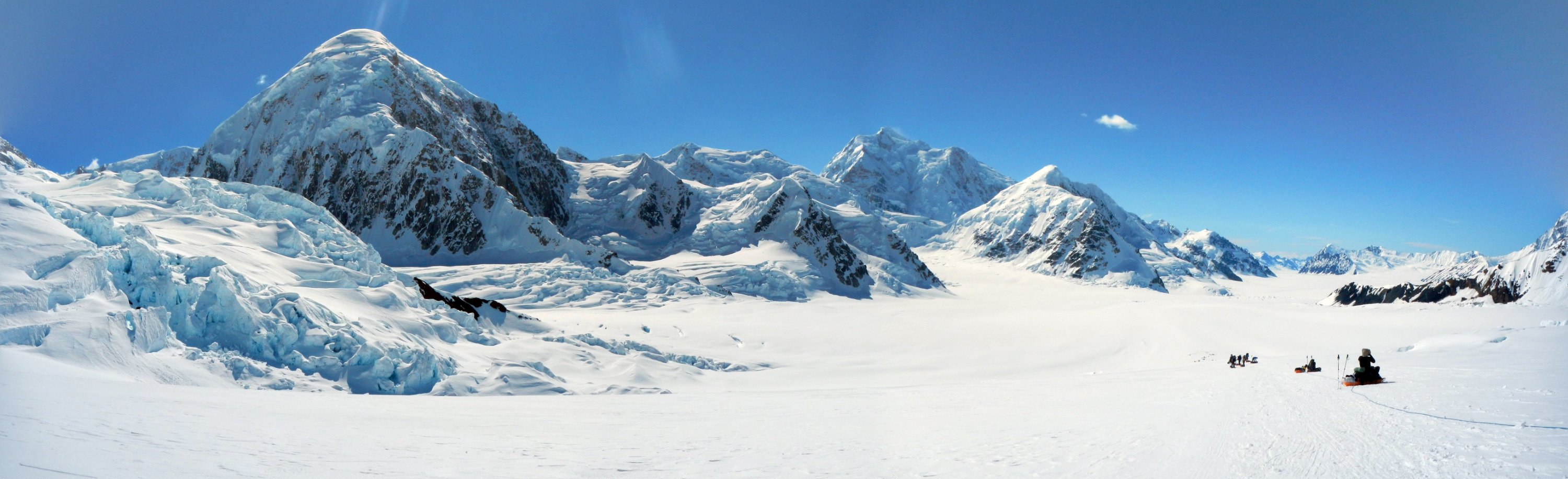 The photograph is a panoramic of the lower glacier on Denali, Alaska. Our rope team were stopped for a break, which we took approximately once an hour. The glacier reflected solar radiation, baking us in the process during the day. Temperatures would hover in the twenties (Celsius), whilst we had to remain fully kitted to avoid sunburn and to protect us in the event that one of us fell into a crevasse, or if the weather changed. On some days we would experience temperature changes of about 50 degrees Celsius as the sun set, and you could hear the crackling sound of ice crystals forming. On another day, I fell into a crevasse whilst roped up, and spent the best part of an hour in the icy blue/black subterranean void waiting to be hauled out… but that’s another story.