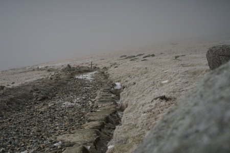 For most of the walk up I was bordering on being too warm, but every now and then I would round a corner and get walloped by a strong wind that would cool me right down. Soon patches of snow appeared and runoff from grass turned into icicles, streams turned to ice, and the snow got progressively deeper where it had accumulated. The forecast called for wind of 20-30 mph with gusts over 40mph and every now and then a gust would try to push me off path.