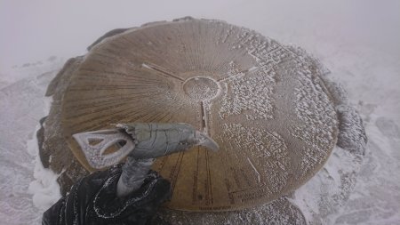 Two thirds of the way up I stopped to put crampons on and to switch to my heavyweight gloves (Black Diamond Guide gloves). The length of time it took me to swap gloves cooled my hands right down and I regretted not having silk-weight liner gloves. By now the remainder of the path was covered in snow and ice, and getting steeper. I got to about 200 vertical metres shy of the summit in whiteout conditions. The path faded, and looking back I realised I might start to struggle retracing my steps. I fired up my GPS to validate my location: I’d strayed a few metres off the path in the snow, and I was just a couple of metres from a steep drop on a ridge. I corrected course and refound the path, and soon approached the obelisk which marks the confluence of numerous paths. Ahead lay the summit, somewhere in the grey-white clag. The winds were stronger now and ahead I could hear a roar that sounded like a powerful waterfall, but I knew it must be the sound of wind driving up the mountainside and over the summit.