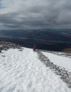Moody skies above a hard-packed snow path, which winds its way to the summit of Ben Nevis.